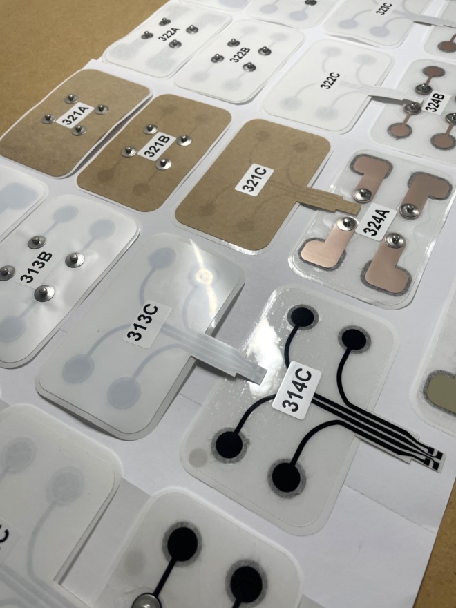 A key part of Screentec’s product development process is systematic experimentation with materials and structures. In the reference picture, prototypes were produced using a range of conductive pastes, including carbon, copper, and recycled silver. In parallel, different substrate materials were tested, such as paper-based and PET-based electrode structures. Each substrate brings its own advantages and constraints, influencing flexibility, sustainability, cost, and end-use performance. By combining multiple paste and substrate options, Screentec is able to assess how different material combinations behave in real manufacturing conditions.
